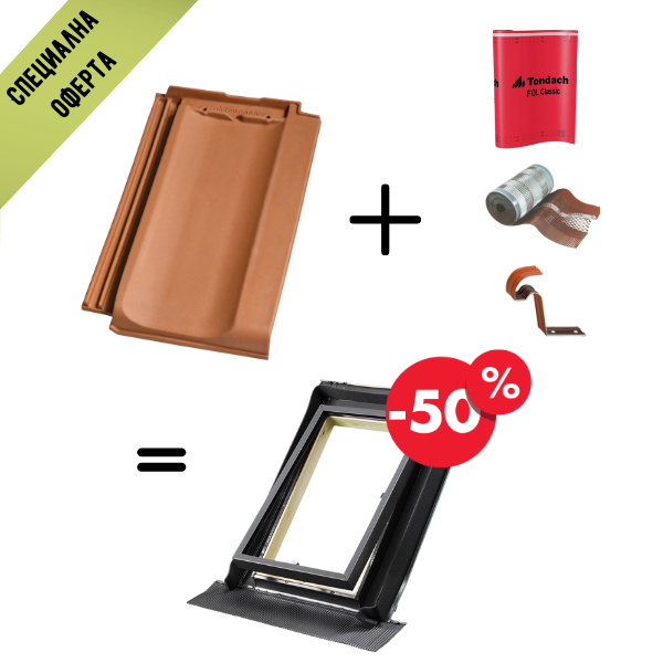 Специална оферта: При закупуване на покривна система Тондах включваща мин 150 м2 керемиди, подпокривно фолиофолио под капаци и скоби за капаци, може да закупите изход за покрив Тондах с 50% отстъпка.