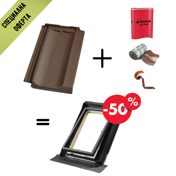 Специална оферта: При закупуване на покривна система Тондах включваща мин 150 м2 керемиди, подпокривно фолиофолио под капаци и скоби за капаци, може да закупите изход за покрив Тондах с 50% отстъпка.