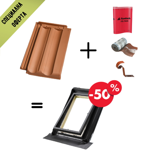 Специална оферта: При закупуване на покривна система Тондах включваща мин 150 м2 керемиди, подпокривно фолиофолио под капаци и скоби за капаци, може да закупите изход за покрив Тондах с 50% отстъпка.
