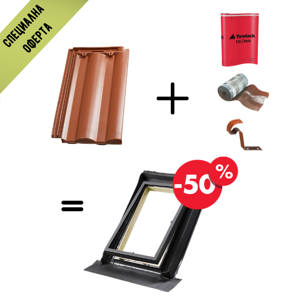 Специална оферта: При закупуване на покривна система Тондах включваща мин 150 м2 керемиди, подпокривно фолио, фолио под капаци и скоби за капаци, може да закупите изход за покрив Тондах с 50% отстъпка.